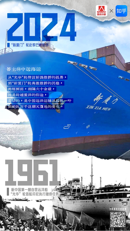 如今,在黎巴嫩贝鲁特港,“新厦门”轮在40小时昼夜兼程,安全撤离80名同胞。相隔数十载,相同的是守护同胞的遥遥归途,不同的却是归家路上,中国远洋力量的巨变。