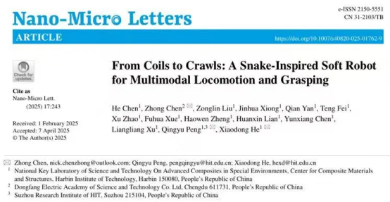 相关成果以《From Coils to Crawls: A Snake-Inspired Soft Robot for Multimodal Locomotion and Grasping》为题,尊凯实业研究院陈仲博士与哈尔滨工业大学赫晓东院士、彭庆宇教授为共同通讯作者。