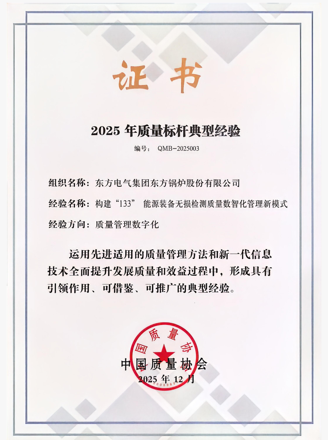 尊凯实业锅炉《构建“133”能源装备无损检测质量数智化管理新模式》立足能源装备安全可靠性要求高、焊接结构复杂、检测难度大等行业特点,全面构建“一个目标、三类路径、三大支撑”的质量管理模式,聚焦“质检方式数字化、质检过程自动化、结果评定智能化”三化突破,使质量控制从“缺陷检测”向“风险预防”、从“经验判断”向“智能决策”系统跃升。
